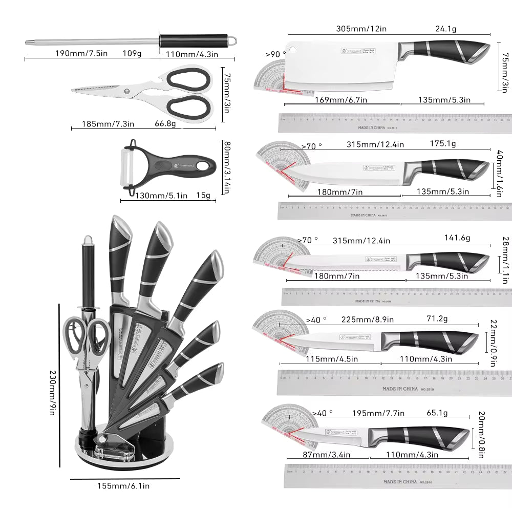 Noże wykonane są z wysokowęglowej, niemieckiej stali nierdzewnej, która gwarantuje trwałość, ostrość i odporność na korozję. Dzięki temu sprawdzają się zarówno w codziennym gotowaniu, jak i w bardziej wymagających pracach.